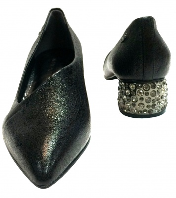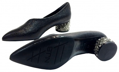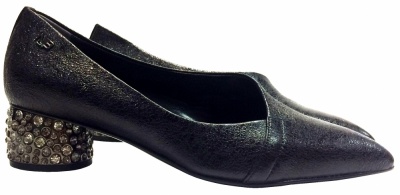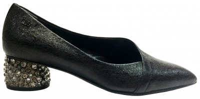 Туфли из натуральной кожи цвета антрацит с эффектом "старения", с подкладкой из натуральной кожи, на среднем каблуке, украшенным настоящими кристаллами Swarovski, и кожаной подошве с профилактической полиуретановой наклейкой.