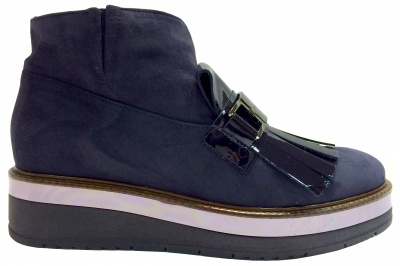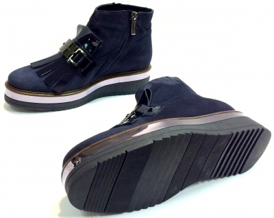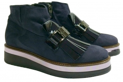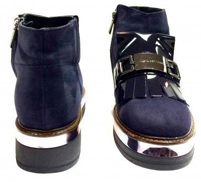 Полусапоги темно-синего цвета из натуральной замши с отделкой натуральной лакированной кожей, с фирменной фурнитурой цвета черненого серебра, с подкладкой из натуральной мутоновой цигейки, на толстой комбинированной подошве (верхний слой - натуральная кожа, нижний - облегченный полиуретан).