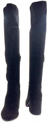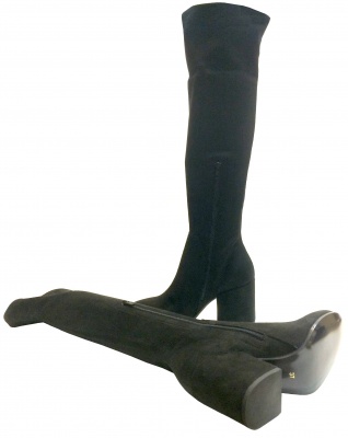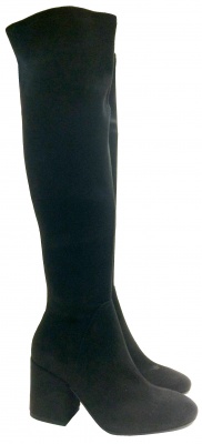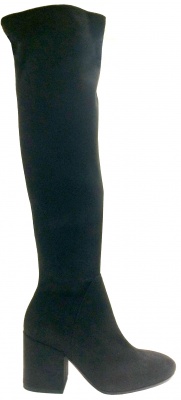 Демисезонные сапоги-ботфорты черного цвета из эластичного синтетического велюра под замшу, с подкладкой из искусственной кожи в союзке, на среднем устойчивом каблуке и полиуретановой подошве.