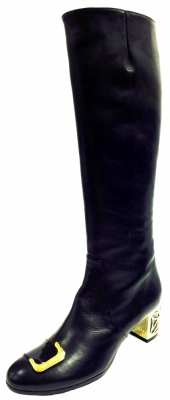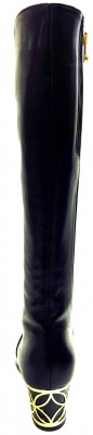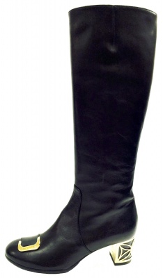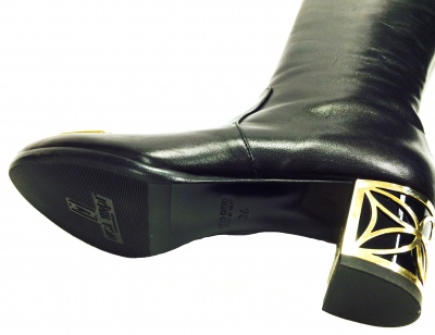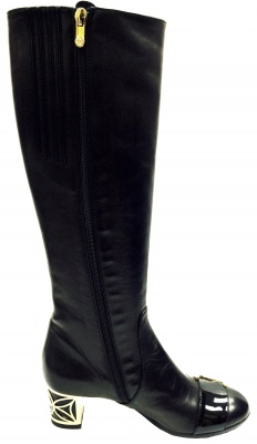 Модные, удобные сапоги из натуральной кожи черного цвета, с отделкой из лакированной кожи, с фирменной фурнитурой цвета светлого золота, на среднем эффектном каблуке из супер-прочного пластика АБС в оплетке из металлического кружева. Подошва из натуральной кожи имеет наклейку с противоскользящим протектором.