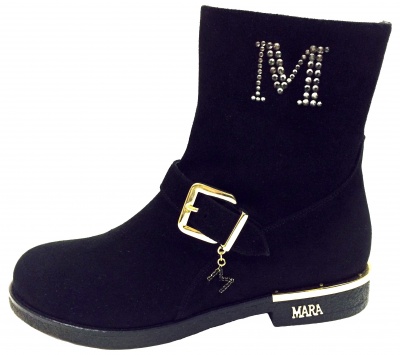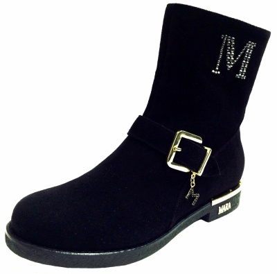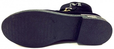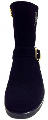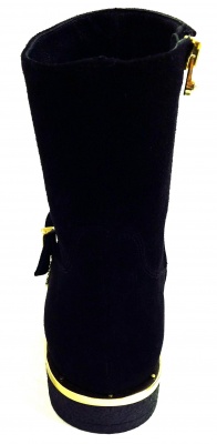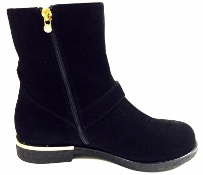 Модные, стильные полусапоги из натуральной замши черного цвета, с эффектной фурнитурой цвета золота, на подкладке из натуральной кожи и натурального меха, на низком каблуке. Каучуковая подошва обладает противоскользящими свойствами.