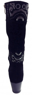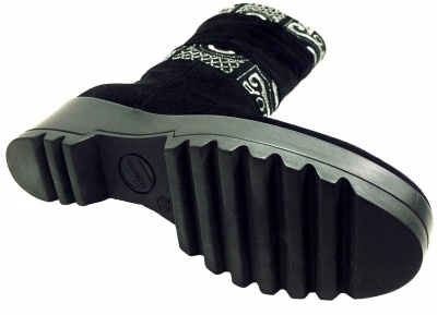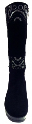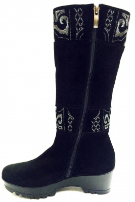 Модные, удобные зимние сапоги черного цвета из натуральной замши, утепленные натуральной мутоновой цигейкой, с эффектной вышивкой серебряной нитью, на танкетке и платформе. Рисунок протектора полиуретановой подошвы обеспечит устойчивость на скользкой поверхности.