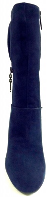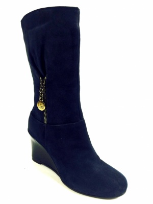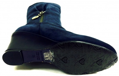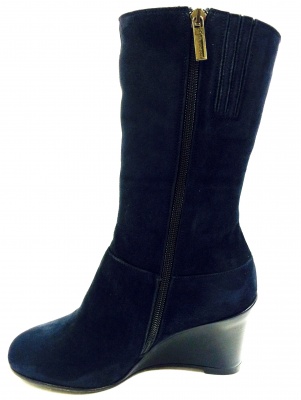 Модные, эффектные зимние полусапоги из натуральной замши темно-синего цвета, с фирменной фурнитурой цвета черненого серебра, на подкладке из натуральной мутоновой цигейки, на танкетке, обтянутой темно-синей кожей. На кожаную подошву наклеена полиуретановая "профилактика" против скольжения.