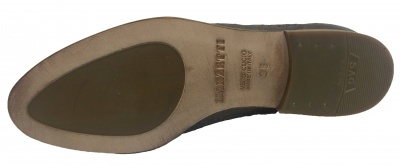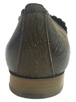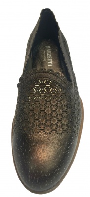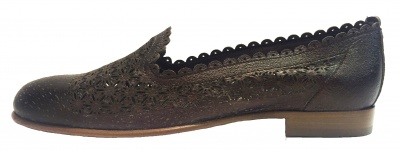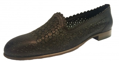 Туфли-лоферы из натуральной кожи темно-бронзового цвета "металлик" с перфорируемым рисунком, на кожаной подкладке, на низком каблуке. Кожаная подошва защищена полиуретановой профилактической наклейкой.
