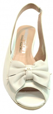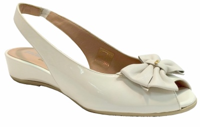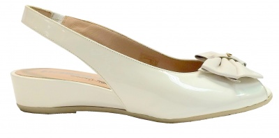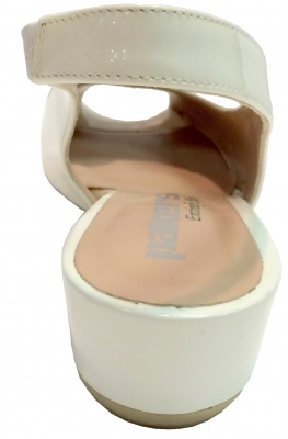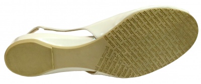 Босоножки белого цвета из натуральной лакированной кожи, с подкладкой из натуральной кожи, на невысокой танкетке и полиуретановой подошве.