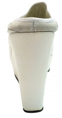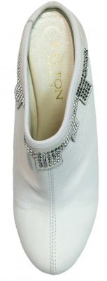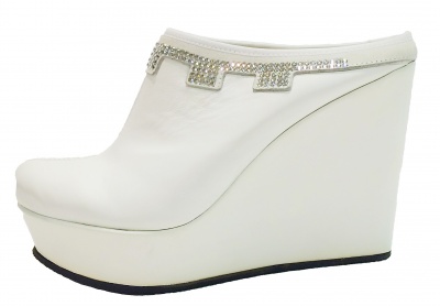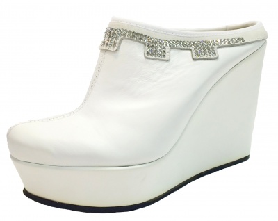 Сабо из натуральной кожи белого цвета, декорированные прозрачными кристаллами, на подкладке из натуральной кожи, на танкетке, обтянутой натуральной кожей и полиуретановой подошве.