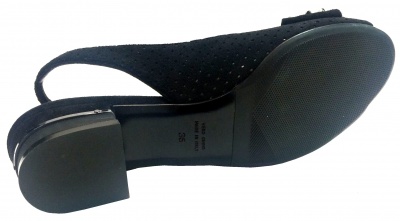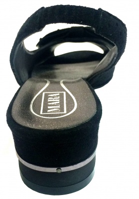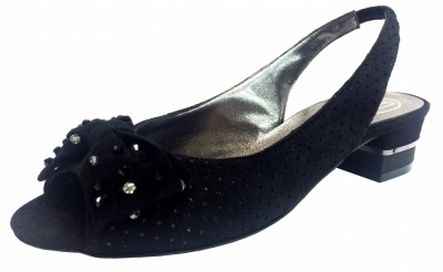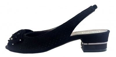 Босоножки из натуральной замши черного цвета, с замшевым бантиком на мыске, декорированным кристаллами Swarovski, с подкладкой из натуральной кожи, на низком каблуке и кожаной подошве с профилактической наклейкой.