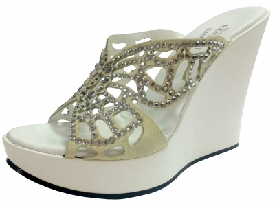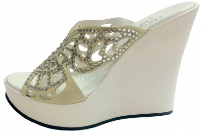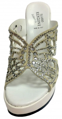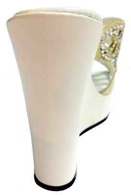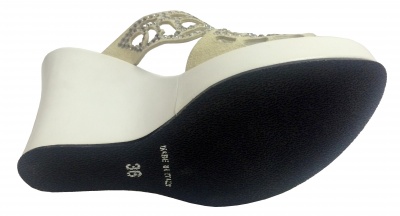 Сабо с верхом из натуральной замши бежевого цвета, декорированные кристаллами Swarovski, на платформе и высокой танкетке из натуральной кожи белого цвета, на полиуретановой подошве.