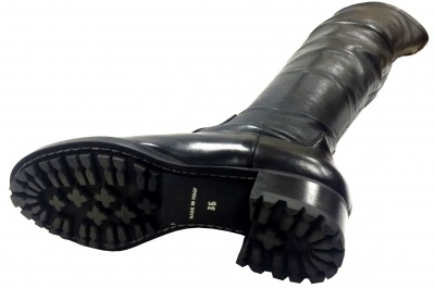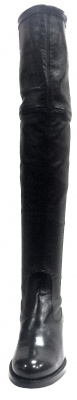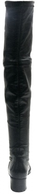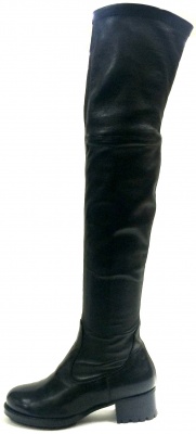 Зимние сапоги-ботфорты стрейч (без молнии) черного цвета из натуральной кожи теленка (союзка) и натуральной кожи-стрейч (голенище), с подкладкой из текстиля (верх) и натуральной мутоновой цигейки (низ), на среднем устойчивом каблуке с эффектом наборного и толстой комбинированной подошве (верх-натуральная кожа, низ-полиуретан) с рисунком протектора, предотвращающим скольжение.