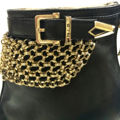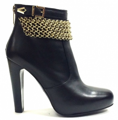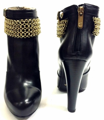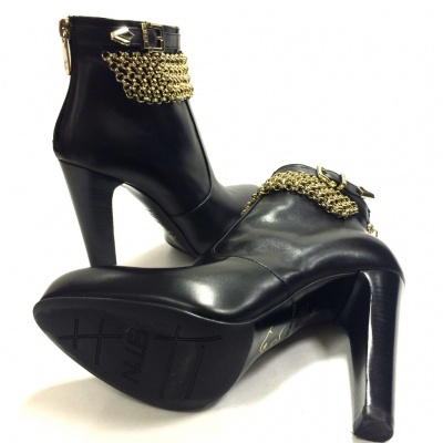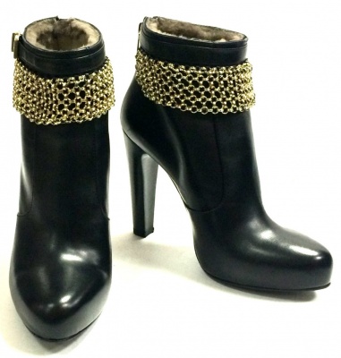 Элегантные зимние полусапожки из натуральной кожи черного цвета, с фурнитурой цвета золота, с подкладкой из натуральной мутоновой цигейки, на высоком каблуке и кожаной подошве с профилактической полиуретановой наклейкой.